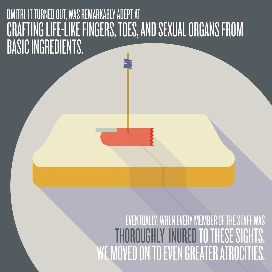 “Dmitri, it turned out, was remarkably adept at crafting life-like fingers, toes, and sexual organs from basic ingredients. He’d fashion frighteningly realistic severed thumbs—skin rudely shredded on one end, bone fragments made from leek white projecting from the wound—and we’d leave these things around for unsuspecting waiters and managers to find. A waiter would open a reach-in in the morning to find a leaking, torn fingertip, Band-Aid still attached, pinioned to a slice of Wonderbread with a frilled toothpick. ....